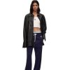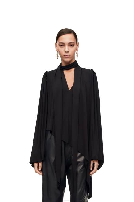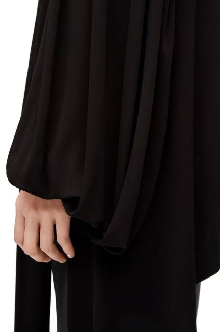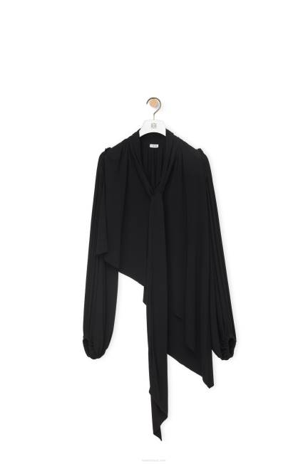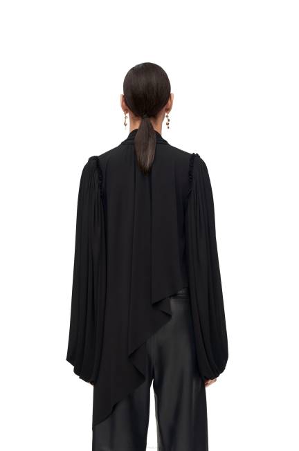 blusa assimétrica com decote em V em jersey viscose crepe com amarração lavalliere, mangas balão com punhos elásticos e detalhe de babado nos ombros.
