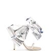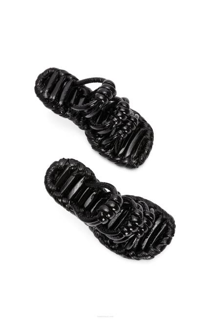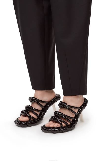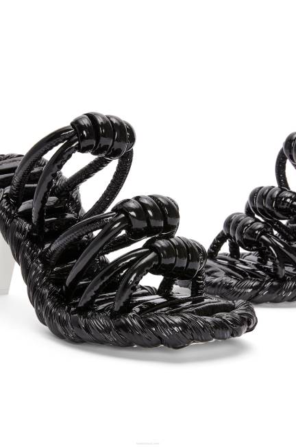 sandália de salto confeccionada com tiras tubulares de pele de carneiro laqueadas que são amarradas à mão e trançadas na ponta da sandália e na palmilha. a coleção de sapatos ss23 joga com a tensão e o contraste: o artesanato se choca com uma atitude fetichista e os materiais naturais se chocam com o técnico. os principais detalhes incluem saltos divertidos, logotipos gráficos e dedos e tiras assimétricos.