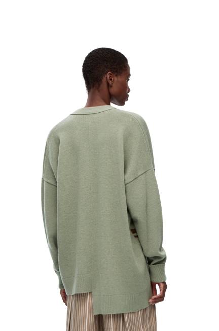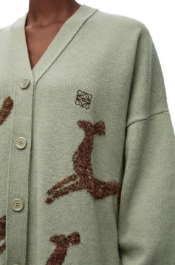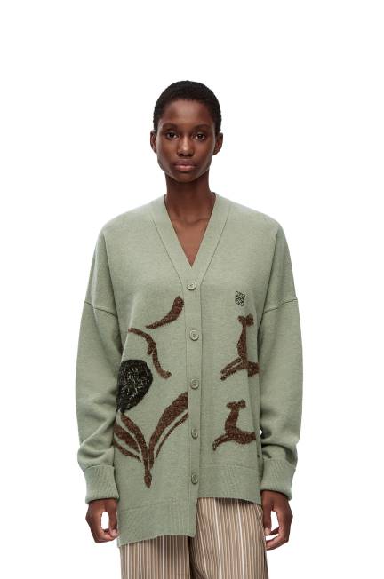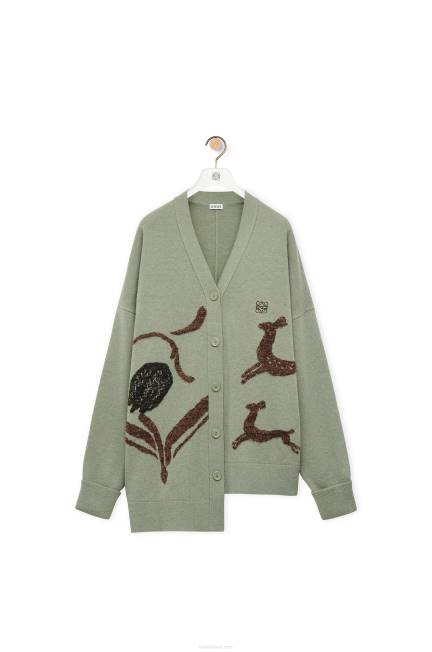 Cardigan assimétrico em lã com decote em V e punhos e bainha canelados. apresentando motivos de veados do arquivo do estúdio britânico potterbernard leach. vários tipos de fios são usados para renderizar um detalhamento de malha intarsia e efeito texturizado.