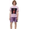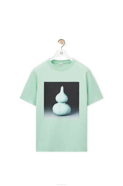 T-shirt de gola redonda em algodão com impressão fotográfica de uma obra de arte em cerâmica da coleção zhuyuetang na frente e descrição do título nas costas.