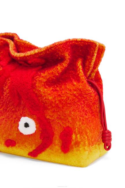lançada na década de 1970, a clutch flamenca fecha com puxadores de cordão com acabamento em nós enrolados característicos. esta versão xl é trabalhada em um shearling degrade feito à mão e apresenta calcifer trabalhada usando uma técnica de intarsia e diferentes profundidades de shearling. faz parte da coleção cápsula do castelo em movimento da loewe x howl.
